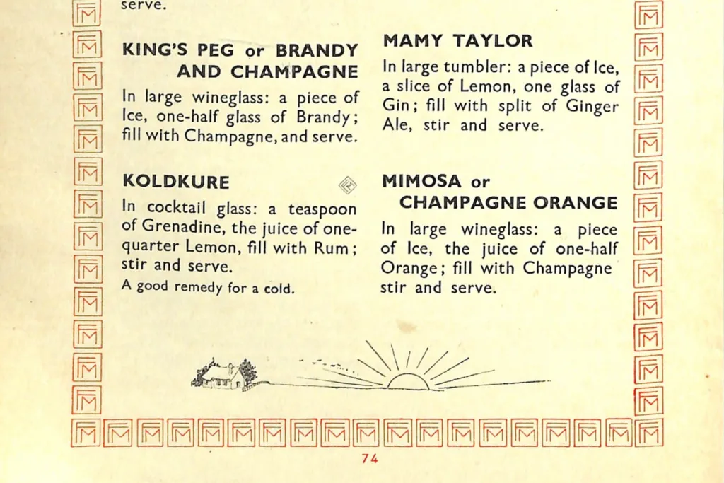 Yet in his own The Artistry of Mixing Drinks book, published 13-15 years after this supposed creation date, Frank Meier makes no claim to its origin, despite a note at the front of the book [page 20] stating "Recipes marked FM were originated by the author" - the Mimosa has no such symbol (a stylised "FM" for Frank Meier in square box repeated around pages – see page 74 image above). Although the drink to the left of it, the "Koldkure" does. Perhaps the author or publisher omitted the crucial symbol or simply marked the wrong cocktail.