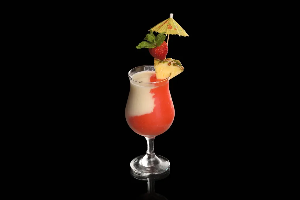 A frozen Piña Colada and Strawberry Daiquiri served in the same glass, either with one on top of the other, or one on each side of the glass. A frozen cocktail for the indecisive!