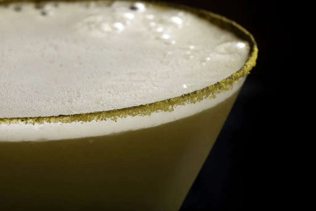 2. RIM glass with 3 parts Matcha powder (ceremonial or culinary grade) to 1 part powdered sugar. (Dip chilled/frozen glass into a plate covered with a thin layer of matcha and sugar mix.)