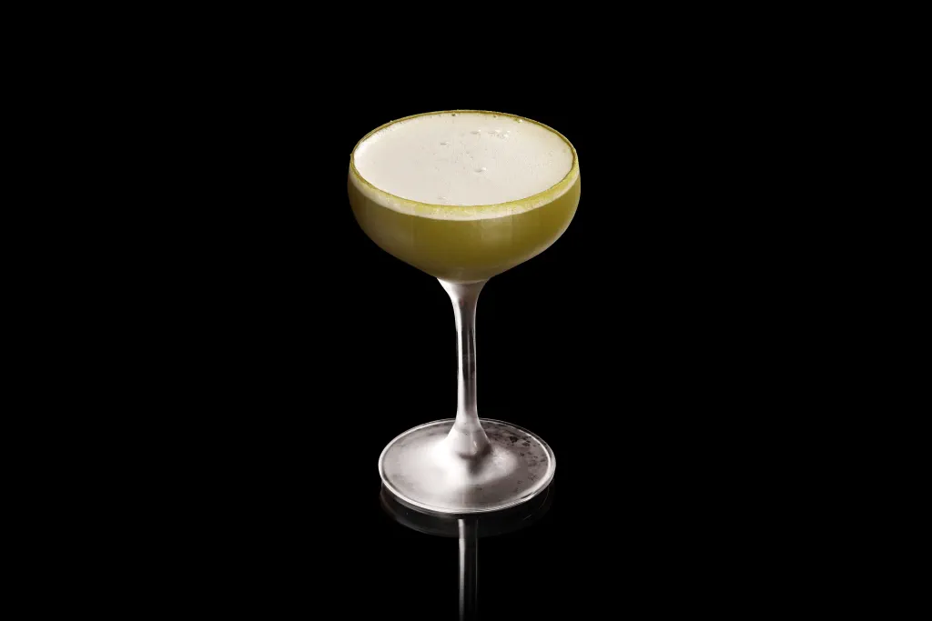 Despite a generous slug of white cacao liqueur in this cocktail, it's dry with matcha supported by, rather than dominated by, chocolate.