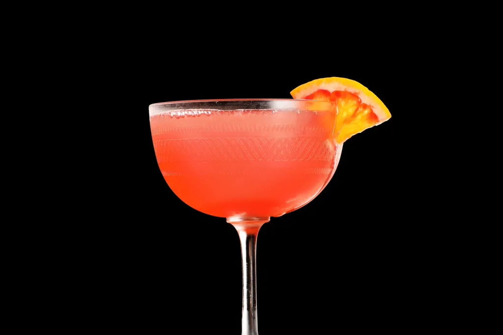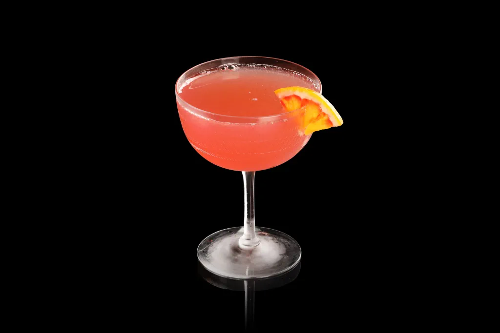 A spiritous sour with apple brandy, dark rum, grenadine and orange fruitiness.
