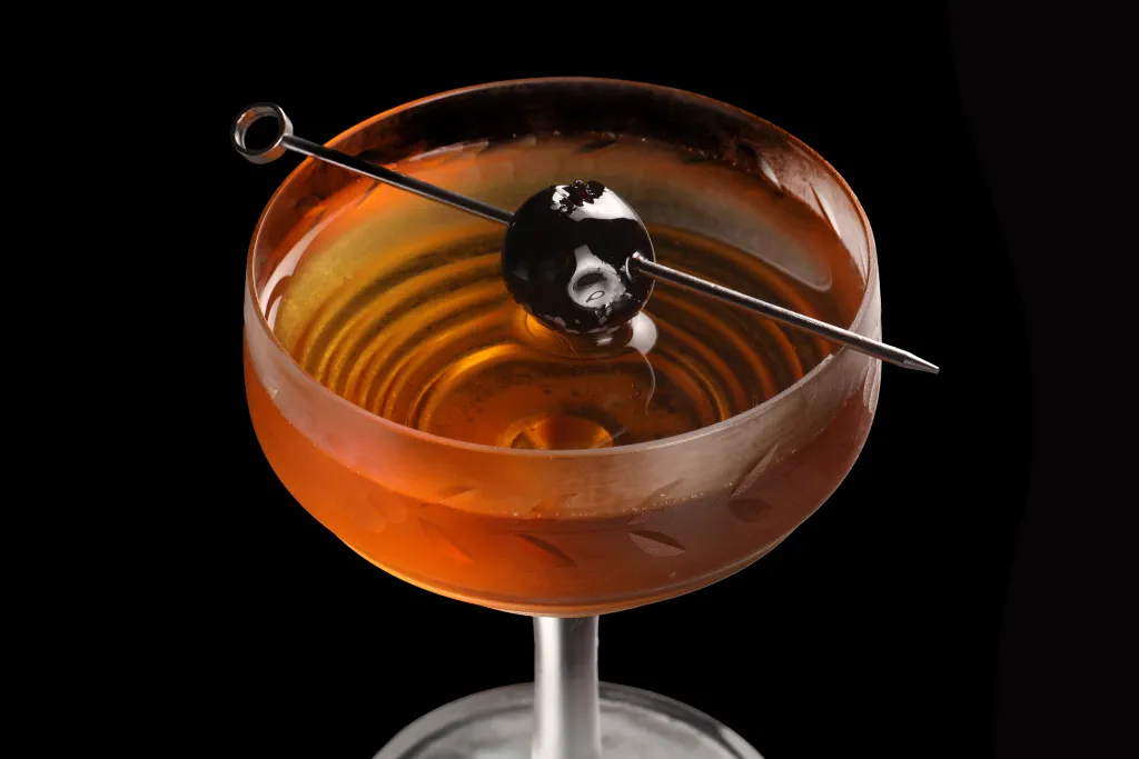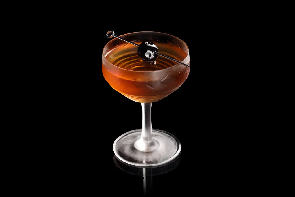 An orange curaçao-influenced Sweet Manhattan.