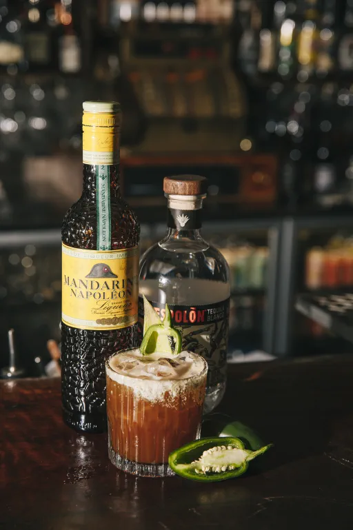 published a cocktail 11 months ago Pico Picante Mandarin liqueurPomegranate molassesPineapple juiceBlanco tequilaJalapeno slice