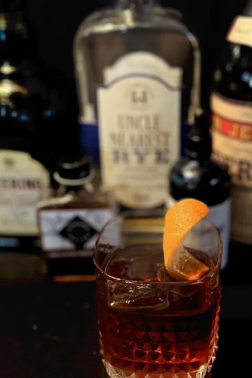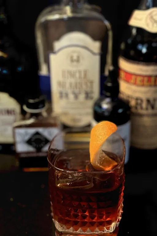 Stir all ingredients with ice. Strain into chilled DOF glass over a large cube of block ice. Express orange zest twist over cocktail and garnish with dark chocolate.