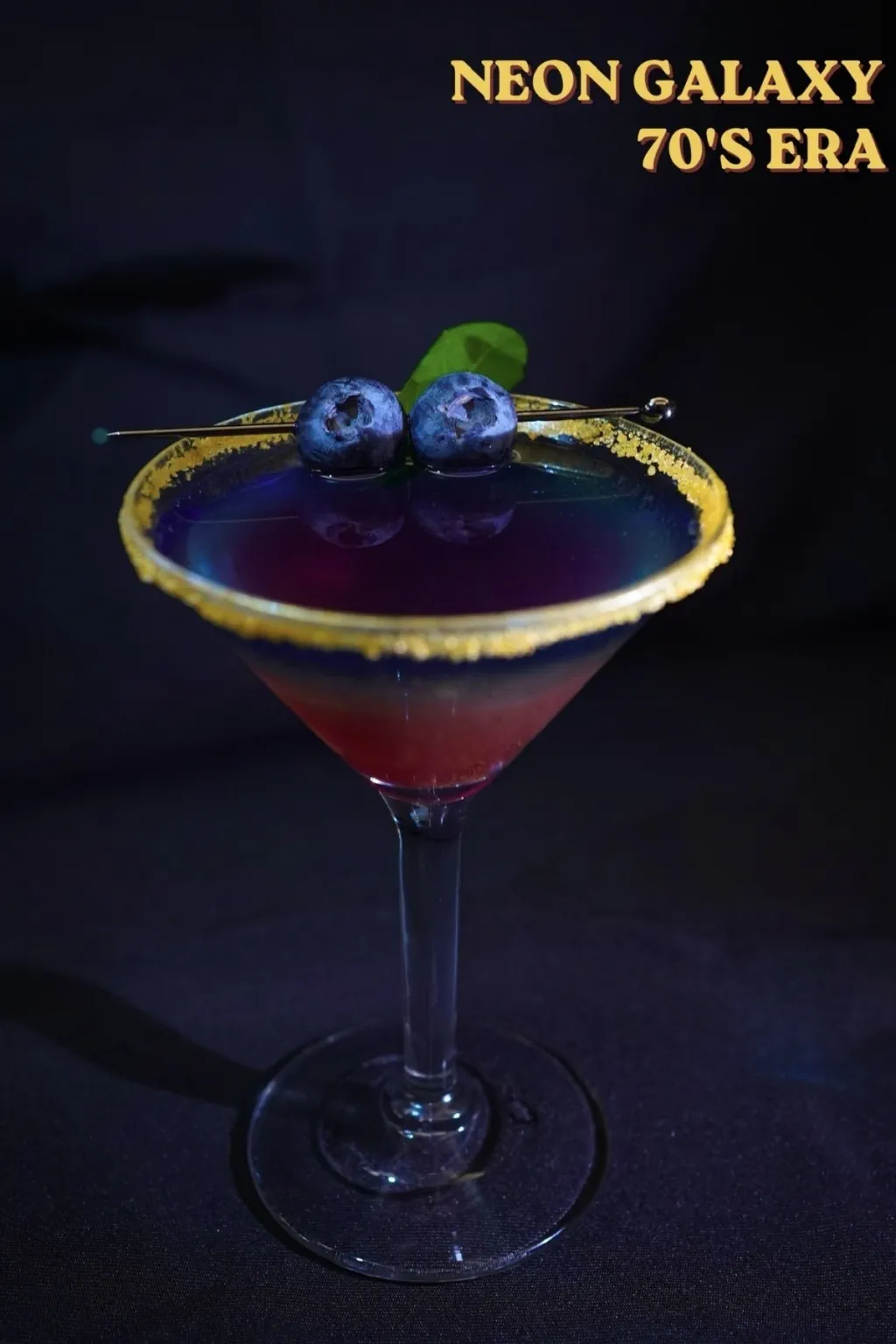 published a cocktail 22 hours ago Neon Galaxy 70’s Era Blue curaçao liqueurGrenadine syrupSugar syrup (2:1)VodkaEdible gold glitter