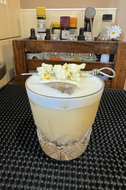 published a cocktail 1 year ago Popcorn Prairie Sour American corn whiskey Lemon juiceVanilla sugar syrupEgg white (pasteurised)