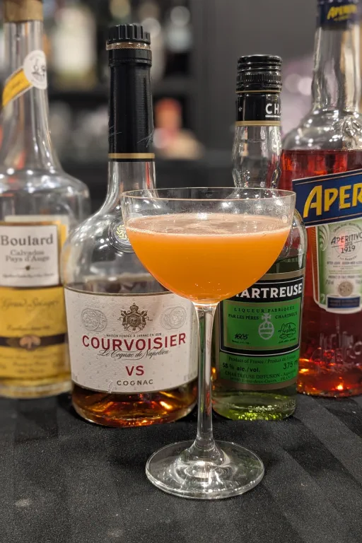 published a cocktail 7 months ago The Tabargnac Cognac (brandy)Calvados apple brandyChartreuse GreenOrange-red aperitivoLemon juice