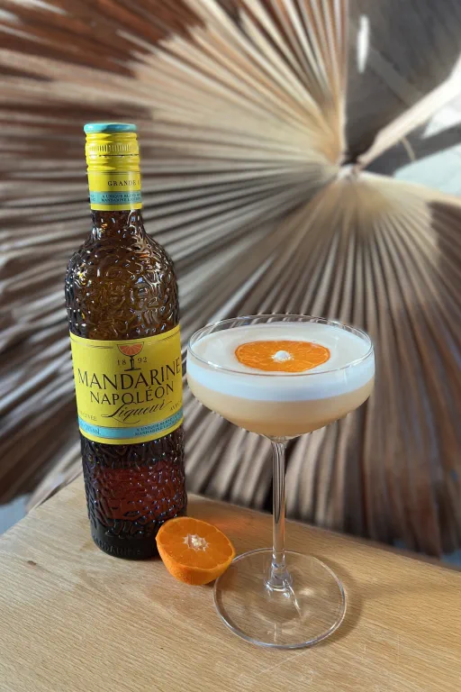 published a cocktail 10 months ago Mandarine Majesty Mandarin liqueurWhite crème de cacaoLemon juiceEgg white (pasteurised)Cocoa bitters